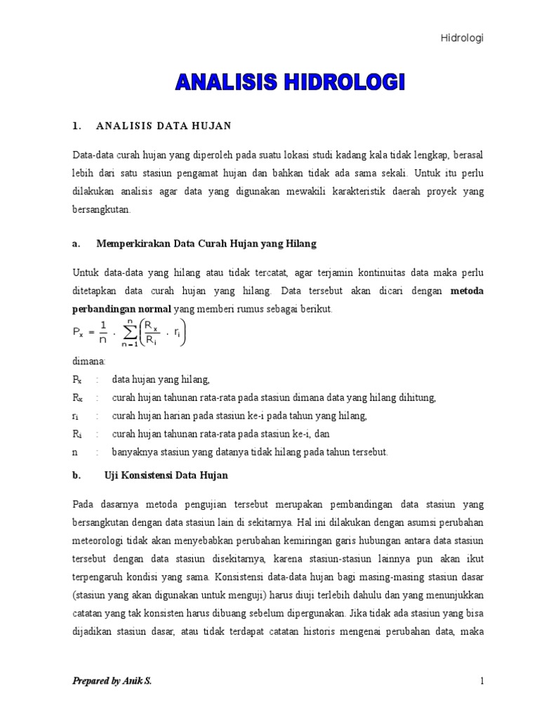 Dalam analisis data hidrologi diperlukan ukuran-ukuran numerik yang menjadi ciri data tersebut. Anugrah Utama Raharja Anggota IKAPI. Analisis hidrologi merupakan tahapan penting dalam kegiatan pengembangan sumber daya air oleh karena itu keluaran dari analisis hidrologi secara umum akan menentukan arah strategi.